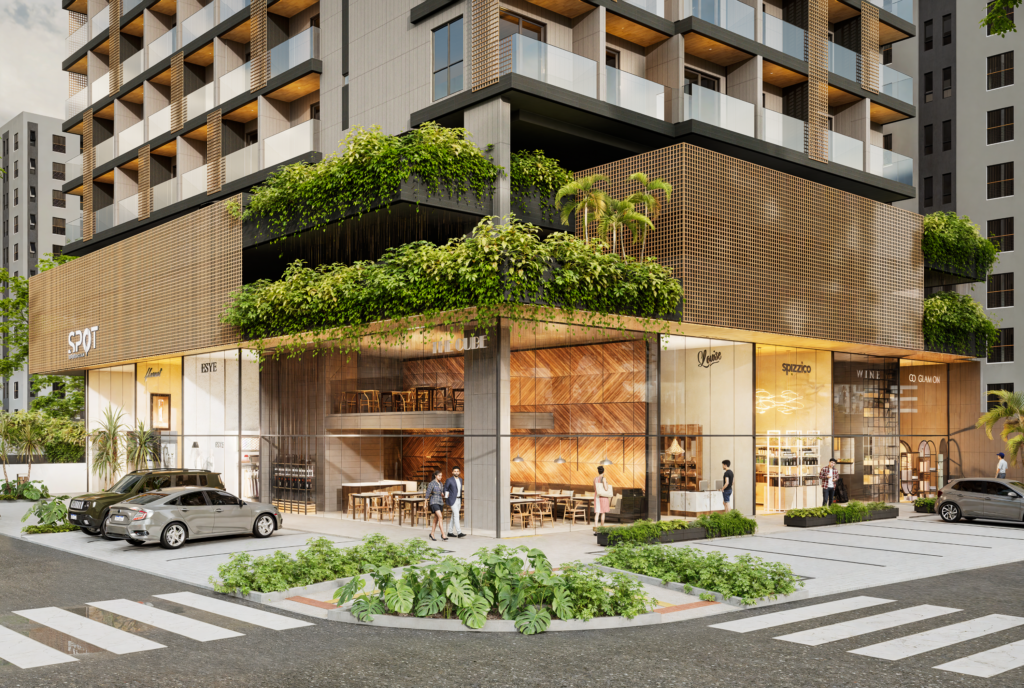 Os primeiros pavimentos reúnem garagem, espaços de convivência e facilidades – como a lavanderia – enquanto o térreo, traz uma fachada ativa que integra o empreendimento à cidade. São 7 lojas voltadas para a rua, além de estacionamento rotativo, criando uma atmosfera dinâmica e acolhedora, perfeita para quem valoriza mobilidade e conveniência no dia a dia.